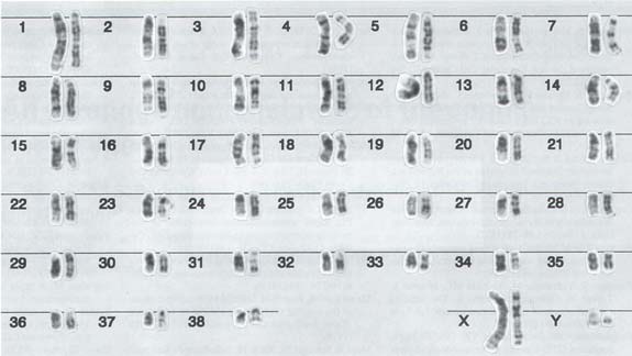 On this karyotype, two X chromosomes and two Ys are shown. Actually, a dog would have one X and one Y and a bitch would have two X chromosomes, for a total of 78 chromosomes.